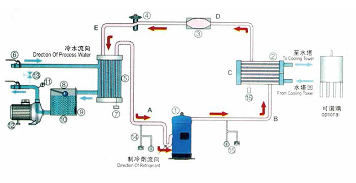 The TIC-W series of water-cooled water chillers use a single closed-loop designfor pressurised refrigerant. All models are equipped with compressor and motor verload protection, phase shortage and reversal alarms, anti-freeze thermostat,pressure gauges, etc. They feature excellent performance and a long lifespan.The series of working flow is based on the basic principle of heat exchange. It is applicable to the industry that requires flow of precisely controlled chilled water,and considered as indispensable equipment for modern industry.