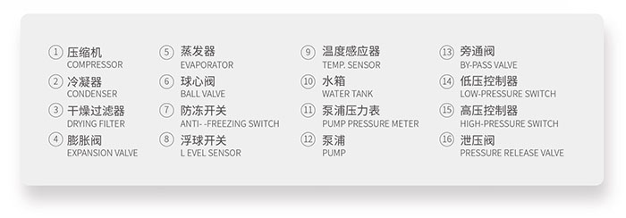 1)Refrigeration capacity is tested under the condition that cold water outlet temperature is at 12° and ambient temperature is at 30°.