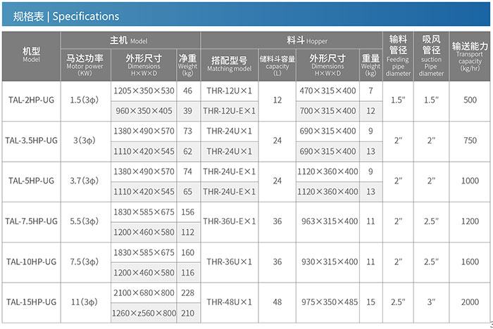 The TAL-UG series has two types of filter devices, bag type and plate type, suitable for conveying operations with 30% and 100% powder content. They can be matched according to
